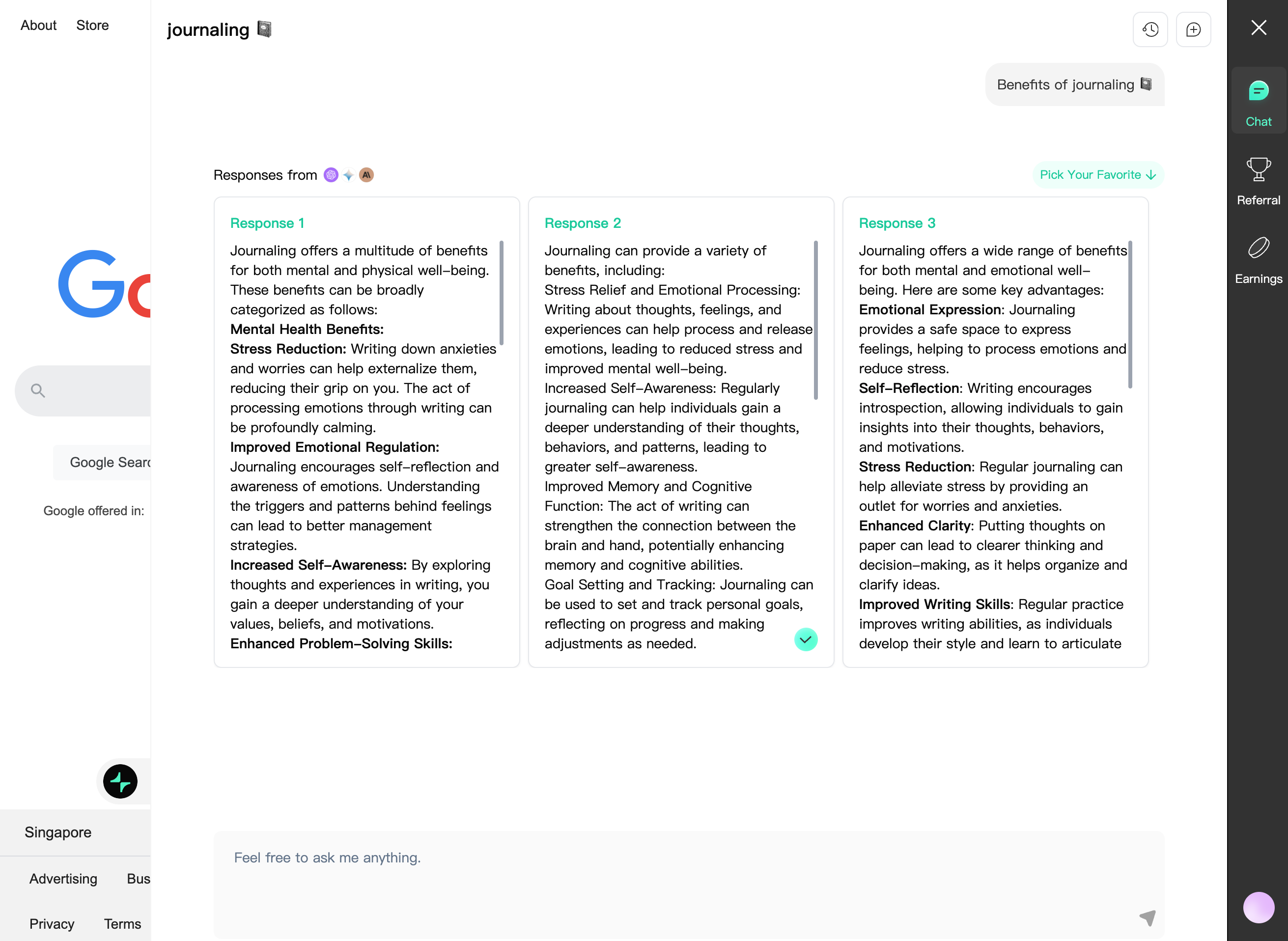 All-in-One Chat seamlessly integrates ChatGPT, Claude, and Gemini into a single platform, generating three distinct replies to every question you ask.